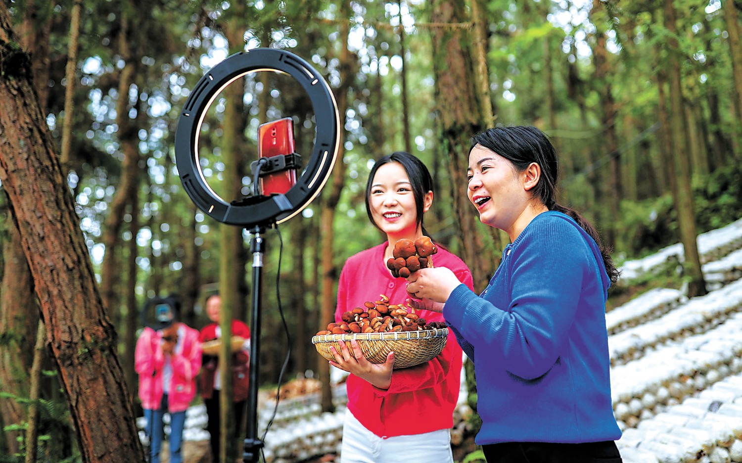 林下经济开启绿色财富密码,成为乡村振兴新亮点。贵州省黔东南苗族侗族自治州岑巩县平庄镇后坪村,志愿者在林下菌菇种植基地直播带货。胡攀学摄
