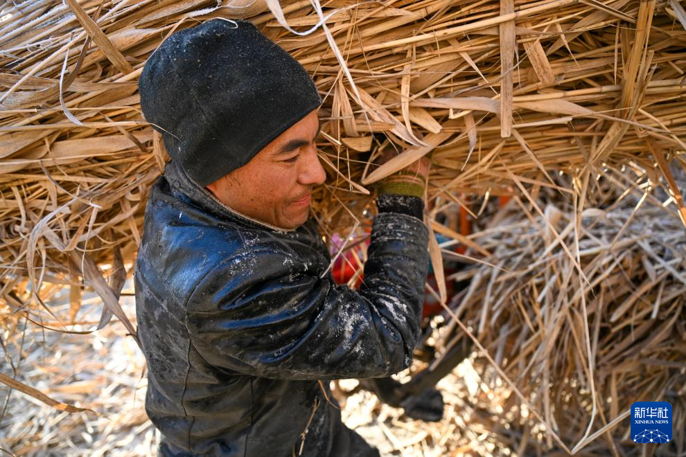 在新疆和田地区墨玉县扎瓦镇,当地农民在收割芦苇(1月10日摄)。